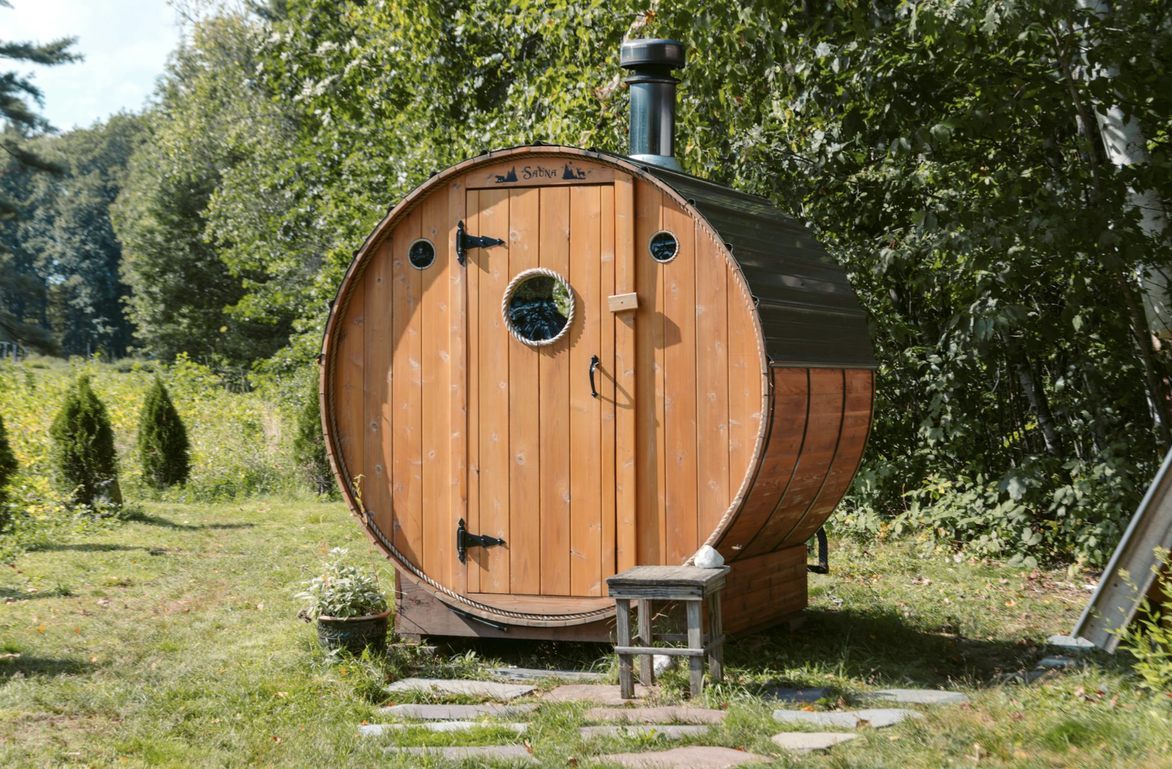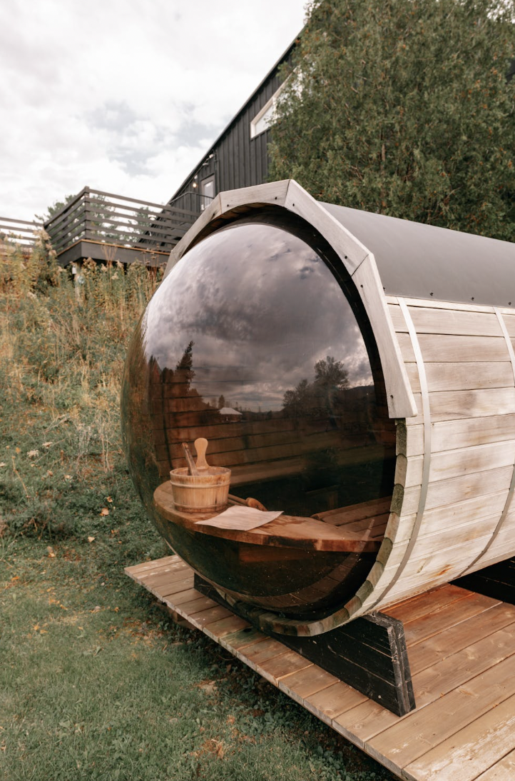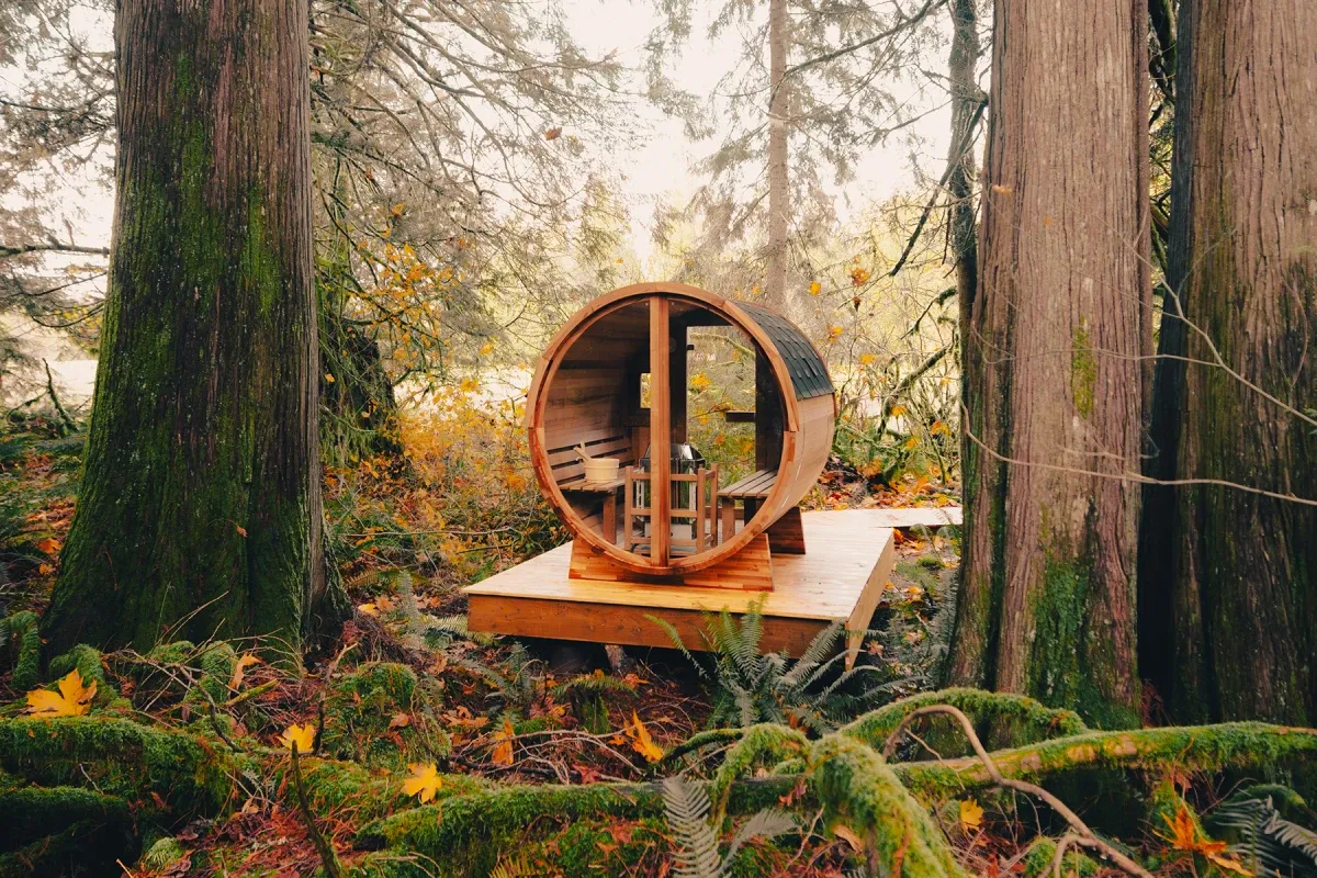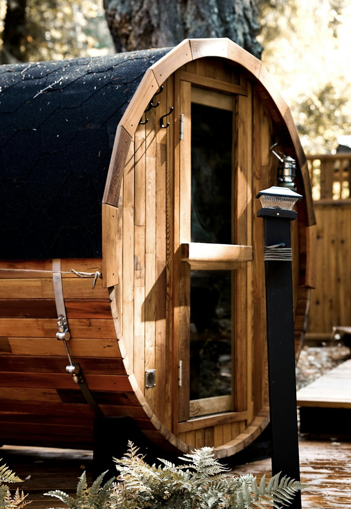 A barrel sauna is a sauna that looks like a giant wine barrel. The shape isn’t just aesthetically pleasing, it’s also more efficient to heat, helps ensure even heating, and allows for ventilation underneath.