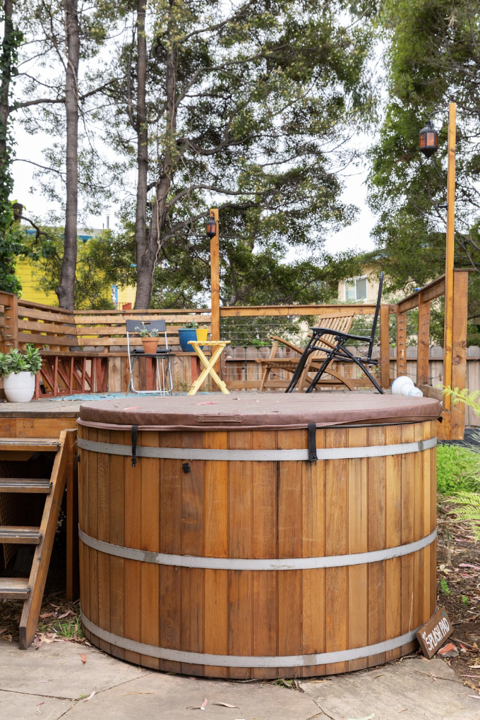 Julia, who shares a duplex with friends in Oakland, loves her outdoor clawfoot tub. Her children enjoy bathing under the trees, and Julia takes her own soak at least once a week. “We live next to a creek, so you can hear it flowing while you’re in the tub,” she said. “We put in a hummingbird feeder so you can watch the birds while you bathe, and installed fairy lights above the tub for night time baths.”