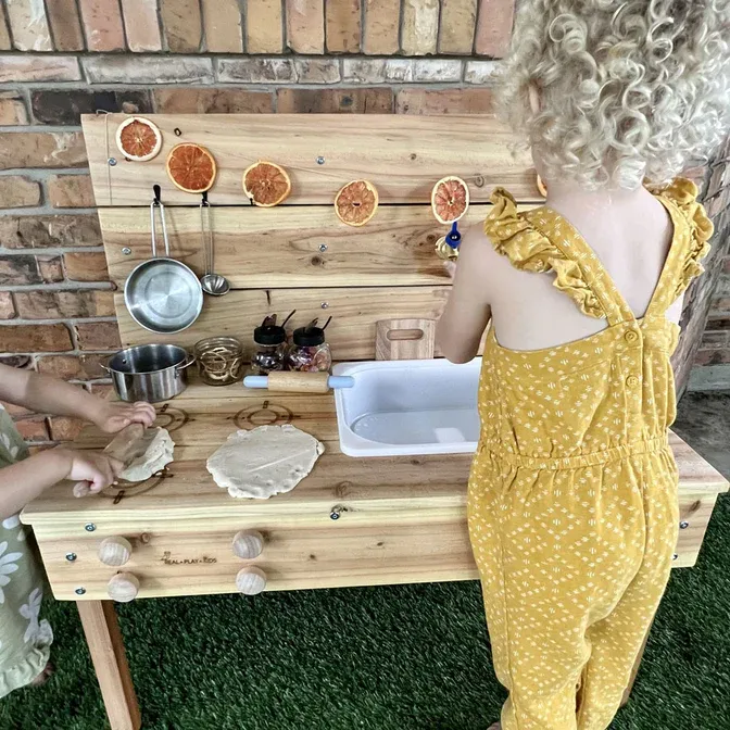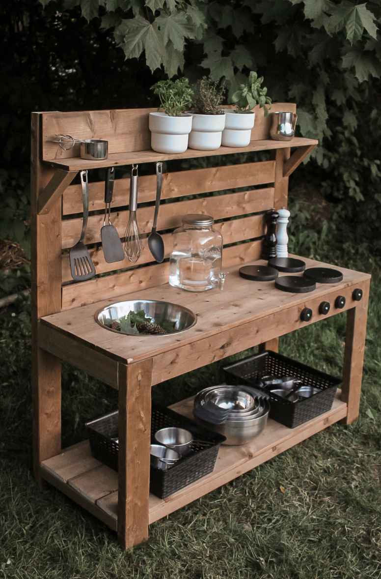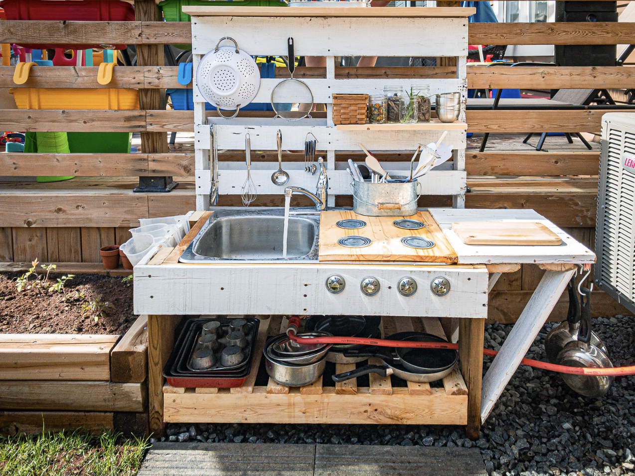 We’ve covered the benefits of parenting near friends. A huge part of this is being able to send your kids outside to play with other kids—bonus points if there’s a designated area to contain the craziness (and the mess). A mud kitchen does this perfectly.