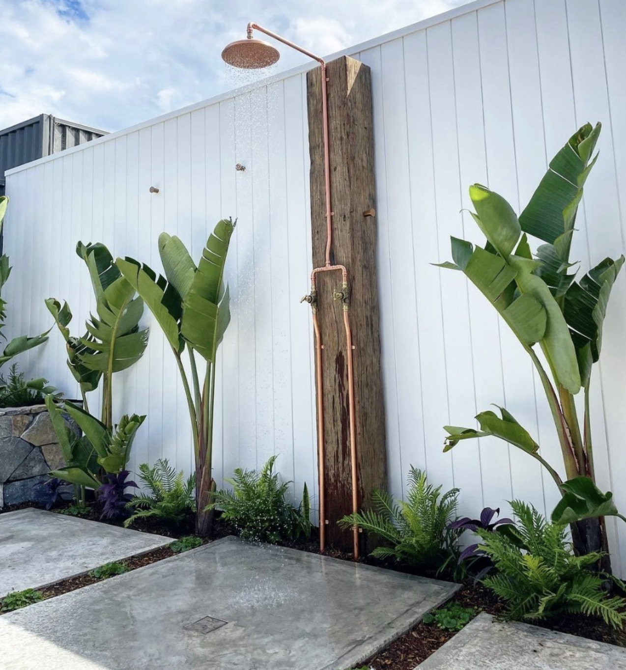 Once you have a tub, it’s also easy to add a shower. Sita Rupe likes extending a shower head into overhanging trees. This provides privacy and hides the shower unit, almost making it feel like you’re taking a rain shower.