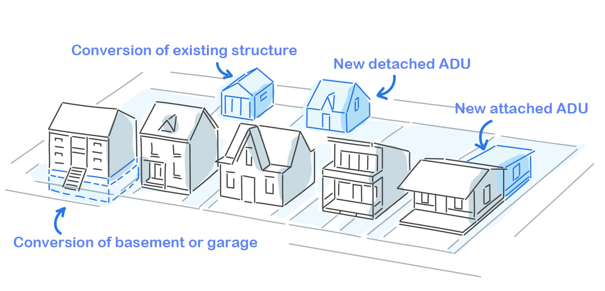 An accessory dwelling unit (ADU) is an independent living space built on the same property as an existing home. ADUs can contain everything you’d expect to see in a regular home, like bedroom(s), bathroom(s), and kitchen.