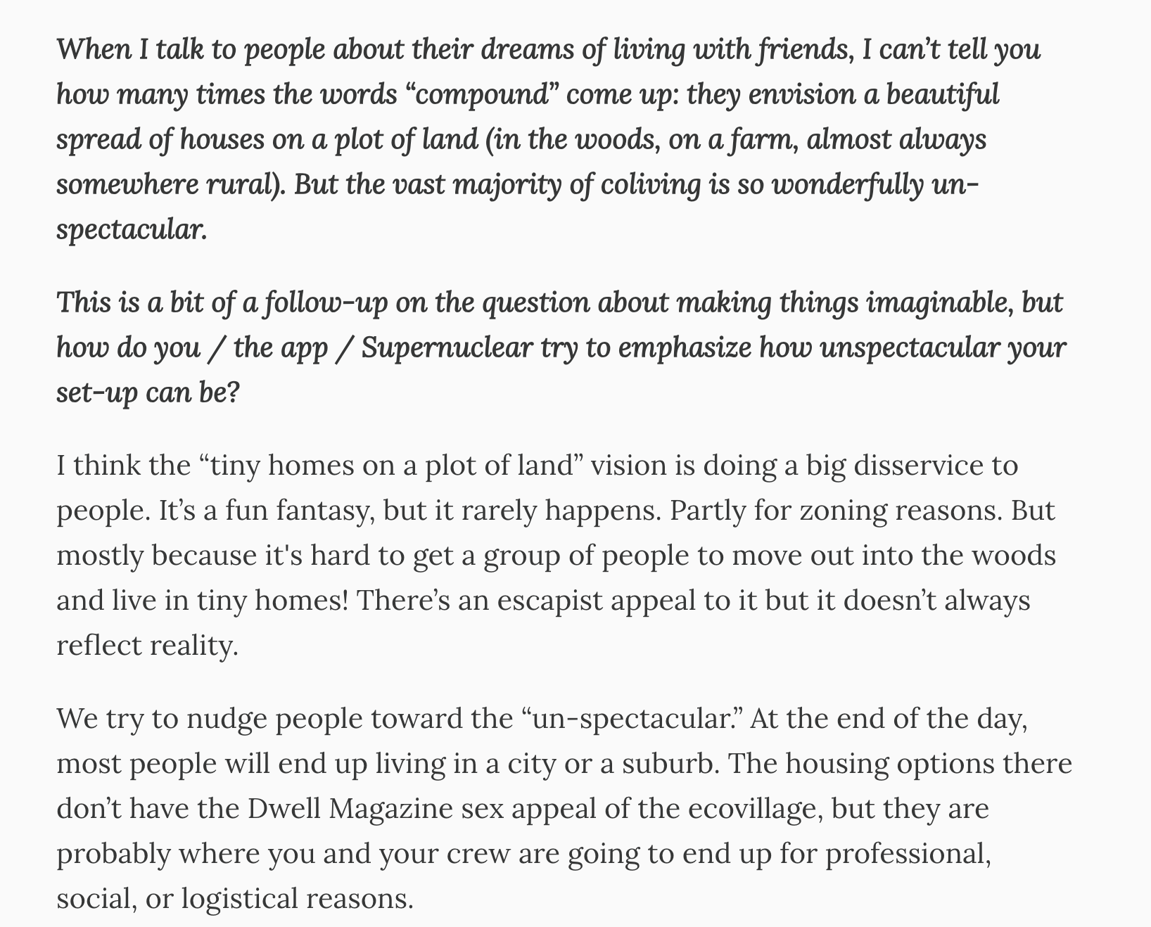 Here’s an excerpt where we talk about how the (often unrealistic) “tiny home on a plot of land” fantasy can distract from more practical, commonplace ways to build community with friends or family: