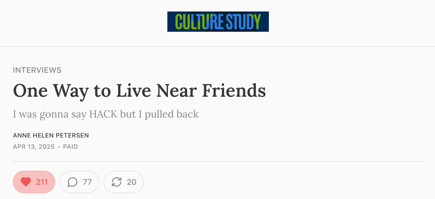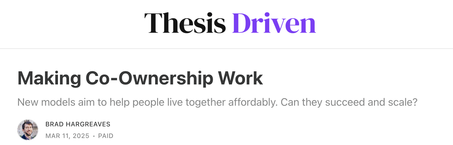 Brad did a piece on co-ownership and talked about Live Near Friends and also Katrina Romatowski who runs reSpace and is a partner of ours in Seattle (Katrina can help you purchase or develop a property with friends). It's paid, but very much worth a subscription if you do anything in the housing world.
