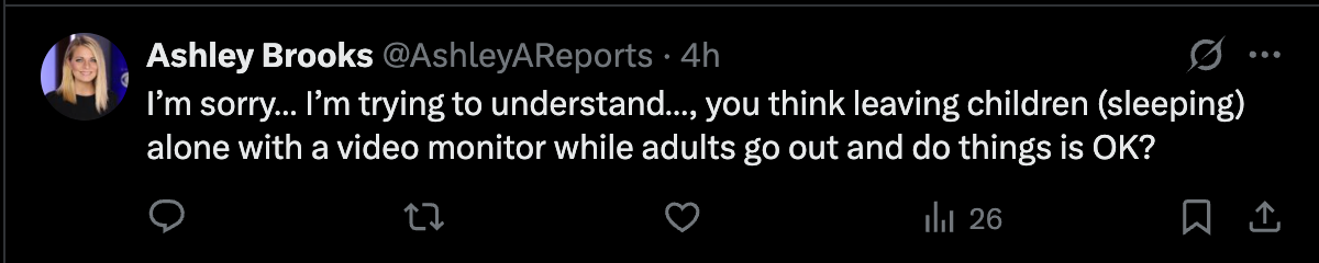 First, on the safety question: having a friend next door watch your baby on the monitor is not any riskier than many other activities we routinely accept in parenting, like driving in a car or crossing a street. It’s not even that different from using a monitor to listen to your child in a house where their bedroom is out of earshot—which is, of course, the whole point of baby monitors.