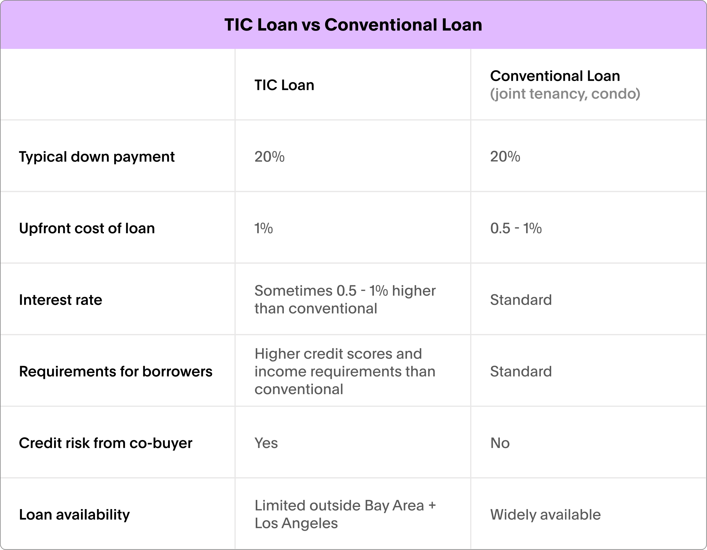 But separate TIC loans do have some downsides: there is still a financial risk from insurance and property taxes, since these must be jointly paid (if your co-owner doesn’t contribute their share of these costs, it could hurt your credit, you might lose your home insurance, or you might be on the hook for their share). TIC loans may have higher upfront fees than conventional loans, and require higher credit scores and income from borrowers.