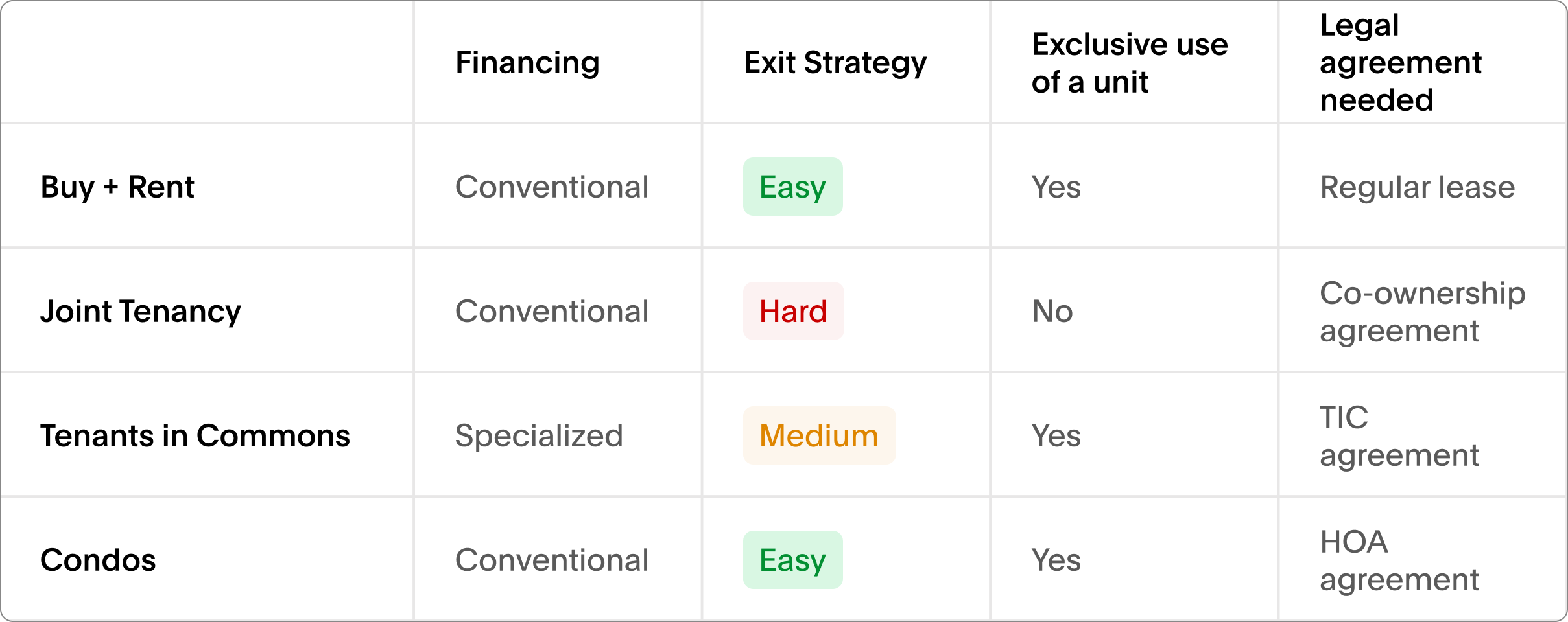 In this article, we’ll cover the four most common ways to own a duplex, and the financing options, required legal agreements, and exit considerations for each ownership structure.